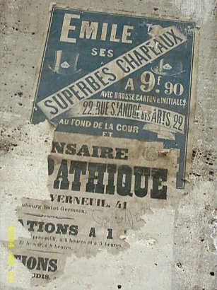 Ces images ont été prise Boulevard St Michel à Paris le 22 Avril 2004 à l'angle d'un magasin en réfection - Ces restes d'affiches qui ont été photographié ont été collés sur ce mur il y environ 120 ans !