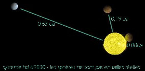 Le système de HD 69830 dans la constellation de la Poupe à 41 années lumières. Découvert en 2006), il s'agit d'un système de 3 géantes gazeuses, les masses sont respectivement de 10, 12 et 18 fois la masse terrienne (ce qui est faible, Jupiter fait 317 x la masse de la Terre) - Il y a probablement une ceinture d'astéroïde à environ 1 U.A. Surnommé parfois le "trident de Neptune"