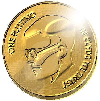 Médaille représentant Clyde Tombaugh, l'astronome qui découvrit Pluton en 1930. L'insolite consiste dans l'inscription "In Clyde we trust", (en Clyde nous croyons) pastiche du "In god we trust" indiqué sur les pièces de monnaie américaines.