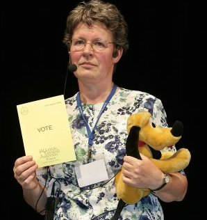 doit la découvertes des pulsars, exhibe au micro de la conférence de l'UAI la peluche