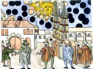 | La Gazette de la ville de Nuremberg en Allemagne relate que des témoins auraient vue dans le ciel à l'aube du 4 avril 1561 des objets bizarres dont des boules "environ 3 dans la longueur, de temps en temps, quatre dans un carré, beaucoup restaient isolées, et entre ces boules, on vit nombre de croix couleur de sang. Puis on vit deux grands tuyaux, dans lesquels petits et grands tuyaux, se trouvaient 3 boules, également quatre ou plus. Tous ces éléments commencèrent à lutter les uns contre les autres" L'événement aurait duré une heure et connu un certain retentissement. Hans Glaser (qui n'a pas assisté à l'événement), en exécute une gravure. On remarquera avant d'aller plus loin que la déformation du message d'origine (un classique des problèmes de communication) fonctionne déjà très bien : que Glaser interprète à sa façon la bataille céleste est logique, qu'il ajoute un crash devant deux témoins, c'est de l'enrichissement pur et simple, la Gazette ne parlant pas de ça. | La Gazette de la ville de Bâle écrit sous la plume d'un dénommé Samuel Coccius, se présentant comme étudiant en "écritures sacrées et en arts libéraux" : "à l'heure du lever du soleil, on a vu dans l'air beaucoup de grosses boules noires qui se dirigeaient à grande vitesse vers le soleil, puis qui firent demi-tour, s'entrechoquant les unes les autres comme si elles menaient un combat, un grand nombre d'entre elles devinrent rouges et ignées, par la suite elles se consumèrent et s'éteignirent" |