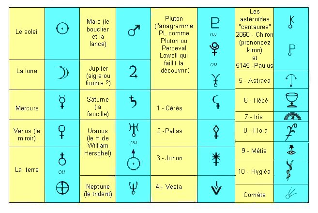 Uniquement à titre anecdotique parce que ça ne sert pas à grand chose, voici le tableau des symboles des planètes :