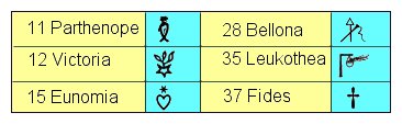 Les symboles des 4 premiers astéroïdes découverts au 19ème siècle ne sont plus utilisés en astronomie et la présence de l'astéroïde "centaure" Chiron (qui en fait est une comète) et de Pholus dans ce tableau laisse perplexe !