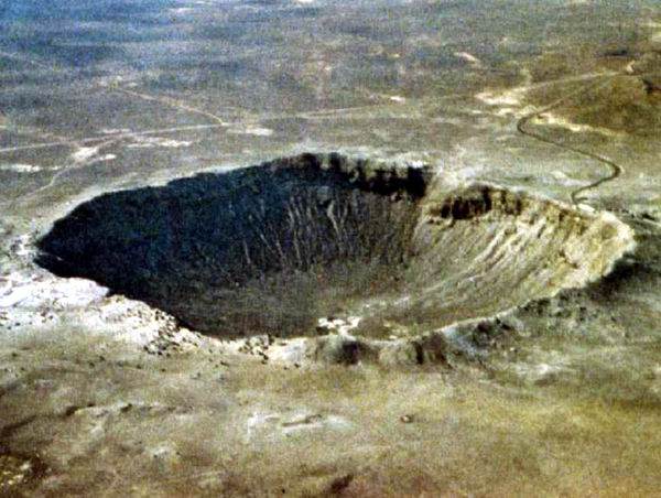 Et, oui c'est sur terre, en Arizona... Une photo de "Meteor Crater". Ce cratère d'impact mesure environ 1 km de diamètre pour 200 mètres de profondeur. On estime que la météorite contenant des matières ferreuses mesurait une trentaine de mètre de diamètre et pesait dans les 60 000 tonnes. Elle aurait percuté le sol terrestre à une vitesse de 75 000 km/heure