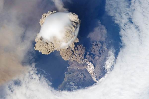 Vue satellite : L'onde de chaleur de l'explosion d'un volcan provoque un trou dans la couche nuageuse