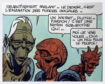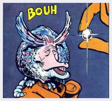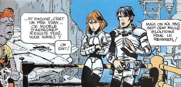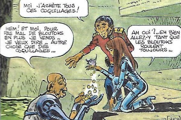 En 1987 passait sur Canal plus une série télévisé délirante intitulée "Objectif nul" (1987) avec Alain Chabat, Chantal Lauby, Bruno Carette, relatant les aventures loufoques du capitaine Lamar et de son équipage à bord du vaisseau spatial "Liberator". La monnaie utilisée dans ce feuilleton est le "BROUZOUF". Cherchant à savoir d'où venait cette expression, une plume anonyme et paresseuse a décrété que cela venait des aventures de Valérian. Et tout le monde de recopier sans se donner la peine de vérifier. Or c'est faux, Valérian et Laureline ont longtemps utilisé l'or comme monnaie d'échange mais aussi d'autres bricoles comme les Perles d'Ebébé. C'est dans "L'ambassadeur des ombres" en 1975 qu'apparaîtra le BLOUTOK (première image). L'information est corroboré dans l'album "Les habitants du ciel" (1991) qui donne les références de tous les néologismes de la série ! On retrouvera les BLOUTOK dans d'autre albums, comme ci-dessous (deuxième image) dans Les Cercles du pouvoir (1994)