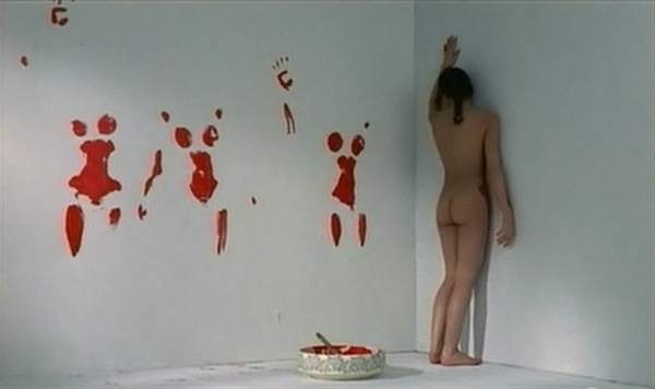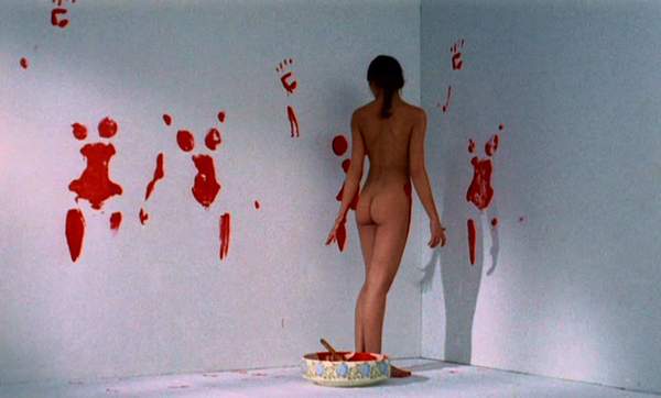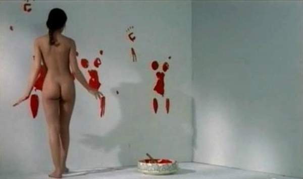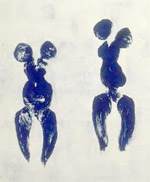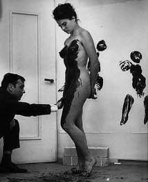 Yves Klein n' a rien inventé (voir cette page), cela ne l'empêchait pas d'avoir la grosse tête et de théoriser. A partir de 1960, il va créer des "Anthropométries" : On vous explique : On prend une nana qu'on enduit de couleur bleu (évidemment), ensuite on colle la petite dame sur une toile blanche afin qu'elle y laisse son empreinte. Et zou, voilà une œuvre d'art ! Note : dans le film "Glissements progressifs du plaisir (Alain Robbe-Grillet, 1974) nous avons droit à une magnifique démonstration d'anamorphoses sur les murs blancs par Anicée Alvina. La scène est d'une beauté à couper le souffle, et si le résultat fascine c'est parce que nous avons vu sa réalisation. Sans cela, le désintérêt remplace la fascination, et c'est sans doute ce que n'a jamais compris Yves Klein.