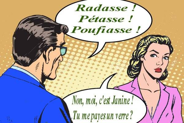 Pétasse : Un grand classique (1878). Parmi tous les mots en "-asse", celui-ci fait figure de référence, et revient au goût du jour ces temps-ci. A l'origine, on appelait pétasse une prostituée occasionnelle ou débutante. Aujourd'hui, ce terme sert surtout à évoquer une fille sexy et vulgaire, habillée de façon très voyante, avec des seins en plastique et une jupe de la même matière. On dit parfois une "super pétasse" (si c'est Pamela Anderson) ou une "lumpen pétasse" (si c'est une des Spice Girls), ou encore une "tassepé" (si c'est Loubry Veronika). Attention : à partir d'une certaine heure, il peut s'agir d'un compliment. A signaler un inconnu célèbre prénommé Joseph Pétasse (1803-1892) dont on peut lire les exploits sur Internet, en revanche on a trouvé personne s'appelant Radasse ou Poufiasse .