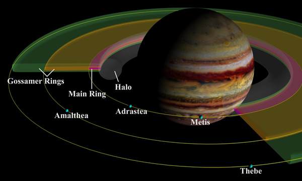 Jupiter possède aussi trois anneaux extrêmement sombres, Les quatre satellites les plus proches, Metis, Adrastéa, Amalthéa et Thebe gravitent dans ces anneaux.