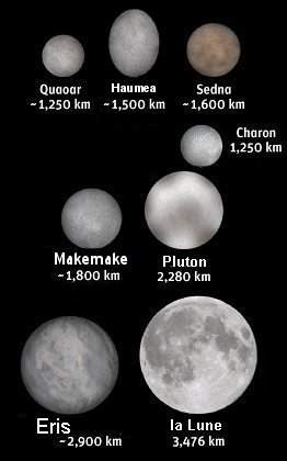 Après avoir découvert des objets modestes on a trouvé de plus en plus gros, jusqu' à ce que fin 2000 on découvre un corps de 900 km (donc équivalent à CERES) que l'on a baptisé Varuna, puis fin 2001 un objet de 1200 km (plus grand que Charon) que l'on a nommé IXION. Le 7/10/2002 on découvrait Quaoar (1280 km) et en février 2004 ORCUS (1305 km)... mais ce n'était pas fini...