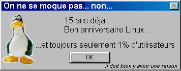 Les linuxiens sont passé maître dans l'art de la communication, grâce à de nombreux relais dans les médias, dès qu'une administration, une entreprise passe à Linux, tout le monde est au courant et on va vous faire des phrases ronflantes sur l'inexorable progression du logiciel libre et blablabla... On doit penser qu'avec de tels succès Linux va bientôt bouffer toutes les parts de marchés... Or il reste toujours à 1 % ! Quel est donc ce mystère ? Tout simplement parce que quand les administrations ou sociétés en question après avoir ramé quelques semaines dans l'environnement Linux se décident à revenir à Windows, personne n'en parle...
