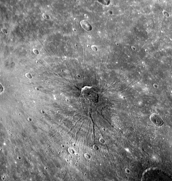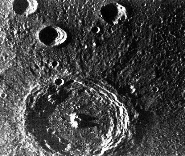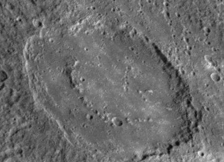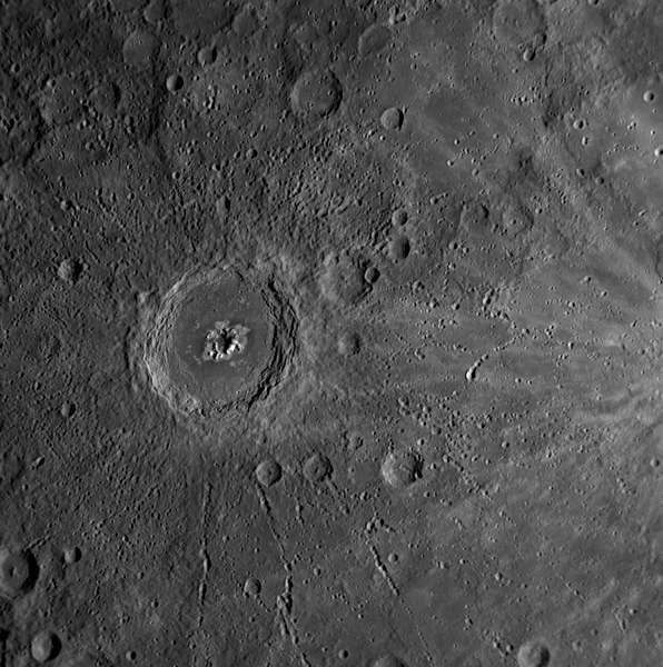 Photographie prise par Mariner 10 en 1974-75 d'un des plus grands cratères de Mercure, le cratère Strindberg (165 km) on se croirait vraiment sur la Lune !