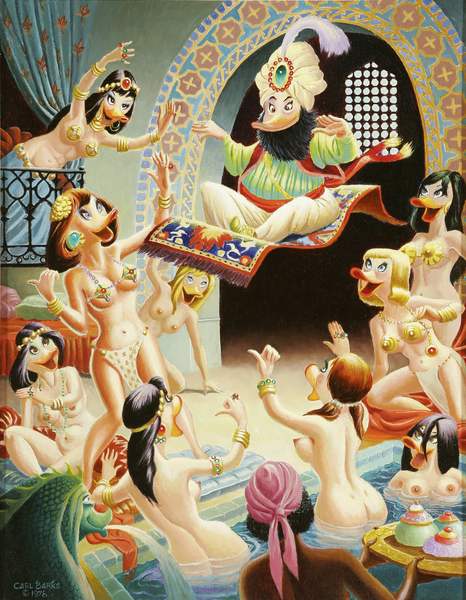 Carl Barks (1901-2000) a travaillé toute sa vie chez Disney, chargé de dessiner les aventures de Donald Duck, c'est lui qui créa le personnage de l'oncle Picsou en 1947, il créa aussi Gontran, Géo Trouvetou, les frères Rapetou et bien d'autres encore. En 1966 Disney lui accorde l'autorisation de peindre ses personnages sur toile, il en profita pour se lâcher un peu et peindre quelques toiles à tirages limités