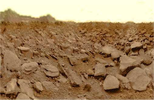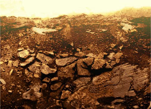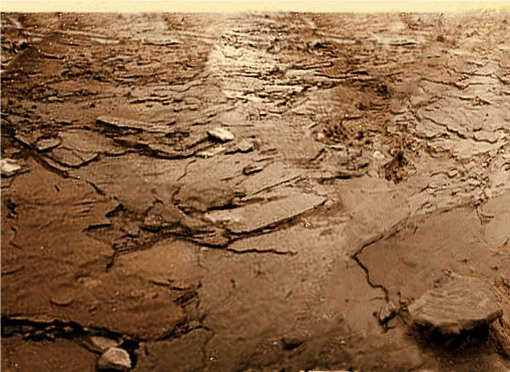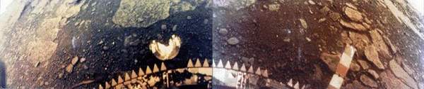 Des cailloux, rien que des cailloux, les photos Noir et blancs ont été prises en 1975 par les sondes soviétiques Vénéra 9 et 10, celles en couleurs par Vénéra 13 en Mars 1982. (Les formes arrondies des premiers plans sont les châssis des sondes). Vénéra 13 survécu 2h 07 dans les conditions extrêmes de température et de pression de la planète Vénus.