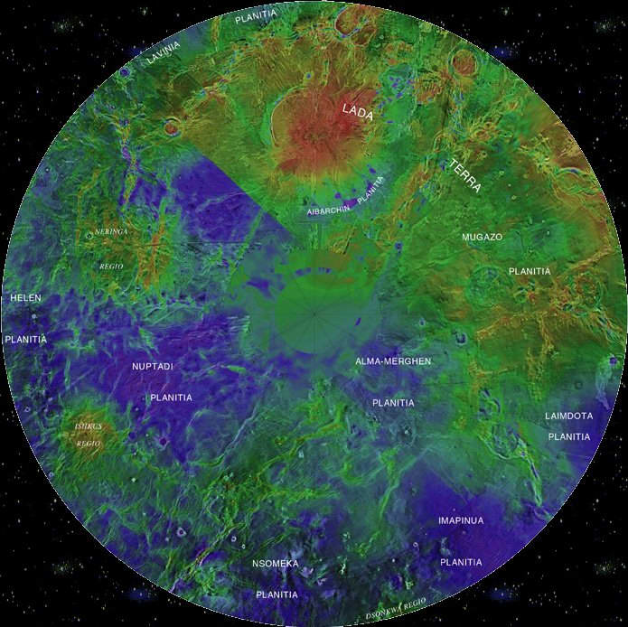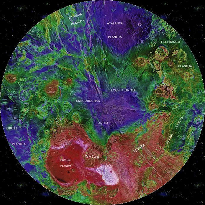 Venus est une planète de plaines puisque, seules deux régions présentent un véritable aspect montagneux : Ishtar Terra et Aphrodite Terra (3.200/ 9.800 km.) A partir d'un niveau moyen, le point culminant vénusien est à 11.500 m, (Maxwell Montes, dans Ishtar Terra) tandis que la dépression la plus profonde est à - 4000 m.