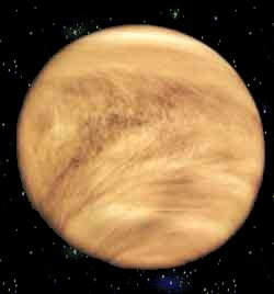 Vénus est la deuxième planète la plus proche du soleil, extrêmement brillante on peut l'apercevoir le matin un peu avant le lever du soleil ou le soir un peu après le coucher du soleil, c'est la planète la plus proche de la terre. On a longtemps cru que c'était la sœur de la terre. Et bien non, la seule similitude est son diamètre (12 100 km)